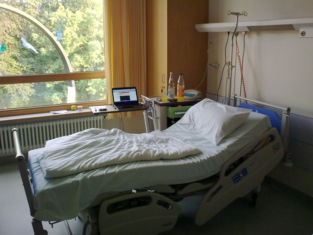 Hansi und ich sind heute morgen gegen halb acht hier her losgefahren und waren dann um kurz vor zehn hier auf dem „Campus“ Dann ging es erst mal Richtung Patientenaufnahme um den ganzen Papierkram zu erledigen. Aufpreis für ein Einzelzimmer kostet 60 Euro. Hätte ich theoretisch bezahlt, wenn noch eines frei wäre, aber es ist hier alles belegt.
