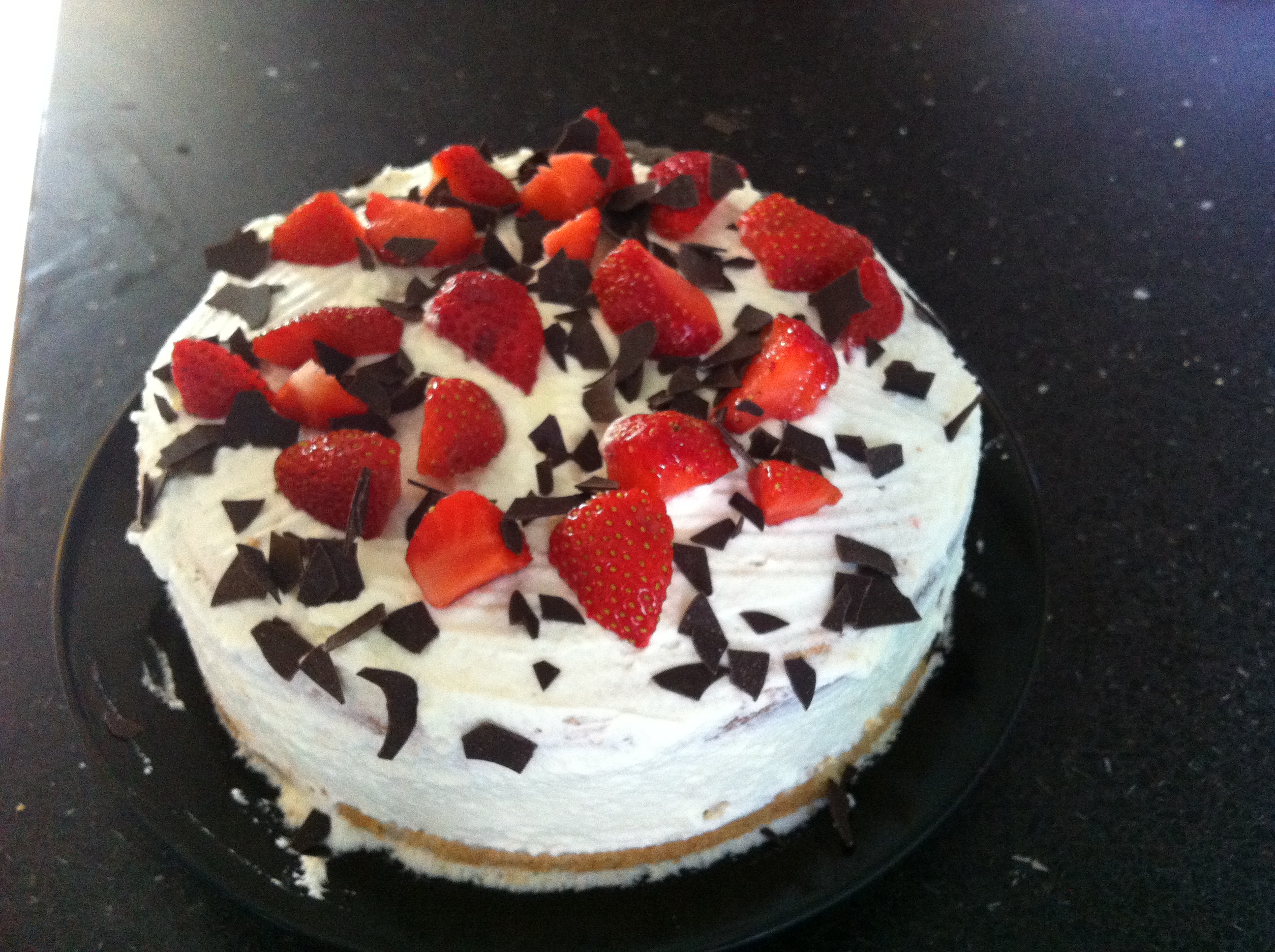 Tortenring lösen. 200g Sahne mit Sahnesteif steif schlagen und die Torte damit rundrum einstreichen. Die Tortenoberfläche mit den restlichen Erdbeeren verzieren. Wer möchte, kann auch noch ein paar Schokoraspel drüber streuen oder gehackte Pistazien. Bis zum Servieren kalt stellen.