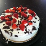Erdbeeren waschen, vierteln und dann in Würfel schneiden. Die eine Biskuithälfte damit belegen. Dann gleichmäßig einen Teil der Sahne darauf streichen. Zweite Biskuitbodenhälfte darauf geben. Dann mit der restlichen Sahne die Torte verkleiden. Ein paar weitere Erdbeerwürfel oben drauf legen und mit Schokoraspel bestreuen.