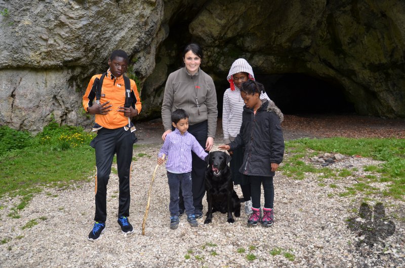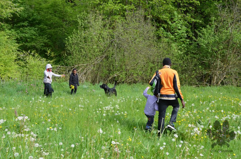 Wir sind nach Bingen ins Bittelschießer Täle gefahren, da es dort neben einem kleinen Rundweg, auch eine Höhle, eine kleine Kapelle auf einem Felsen und noch vieles mehr zu entdecken gibt. Beau hat die Kinder mit in seine Welt genommen. Für manche war es der erste Besuch überhaupt in ihrem Leben im Wald. Sie sind mit uns eine große Runde durch den Wald gelaufen, haben Blumen gepflückt, für Beau einige Dummys versteckt, sind mit ihm um die Wette gerannt und zum Abschluss wurden noch kleine Kuchen gegessen, die ich heute morgen noch gebacken hatte.
