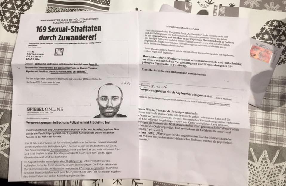 Zum einen erreichte mich vor neun Tagen ein Brief ohne Absender und ohne irgendwas. In dem Brief waren lauter kopierte Zeitungsartikel von vorletzter Woche über Flüchtlingsstraftaten enthalten. Alle scheinbar wichtigen „Fakten“ sind fein säuberlich unterstrichen…. Was geht in manchen Menschen vor?!?