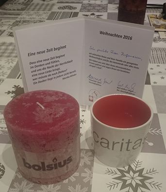 Neben einer Karte, bei der man sogar handschriftlich persönlich noch angesprochen wird (also nicht nur so ein 0815 Massendruck, der „Jeder“ bekommt) gab es eine wundervolle Kerze und eine Caritas Tasse. Habe mir dann direkt mal eine Tasse Tee gemacht und die Kerze dazu angezündet.