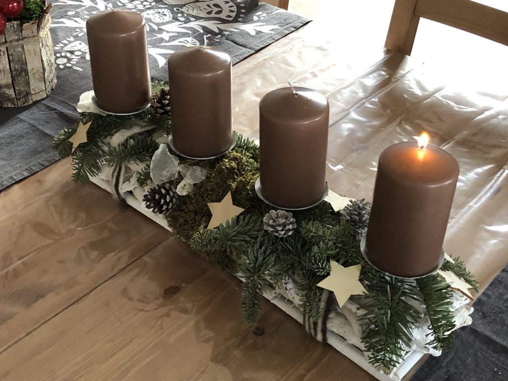 Bei mir ist es quasi ein Adventsgesteck und kein Kranz im klassischen Sinne. Aber ich habe die erste Kerze vorhin angezündet.