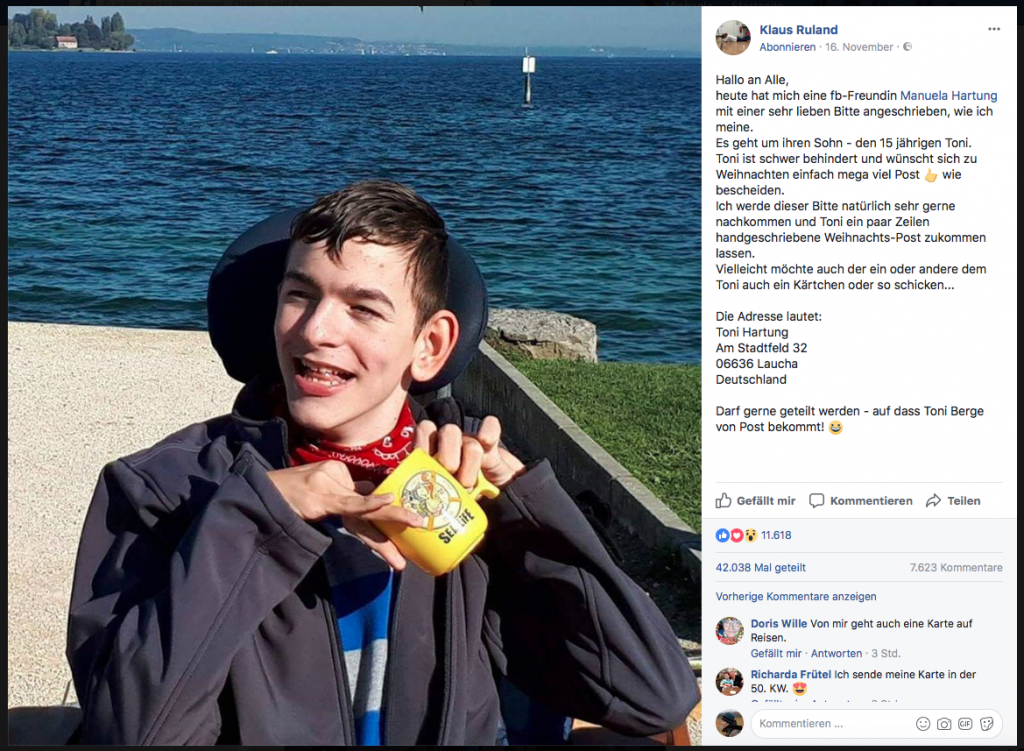 Heute möchte ich mit Euch noch etwas teilen was ich die Tage auf Facebook gesehen habe. Und zwar ist es ein Aufruf eines Fotografen, der den Wunsch eines Kindes gerne unterstützen möchte. Und zwar handelt es sich um einen 15 jährigen Jungen, der zu Weihnachten einfach gerne mega viel Weihnachtspost hätte. Ich finde das wirklich toll und die erste Post ist wohl auch schon bei Toni eingetroffen. Der MDR hat hier auch bereits darüber berichtet. Ihr könnt gerne den Bericht hier anschauen. Ich werde Toni definitiv die Tage auch noch Weihnachtspost schicken und ich würde mich freuen, wenn der ein oder andere von Euch vielleicht auch noch ein paar liebe Worte und eine schöne Weihnachtskarte für Toni übrig hätte. Die Adresse von Toni könnt ihr rechts in dem Foto entnehmen. Wenn ihr auf das Foto klickt könnt ihr das alles auch noch größer sehen.