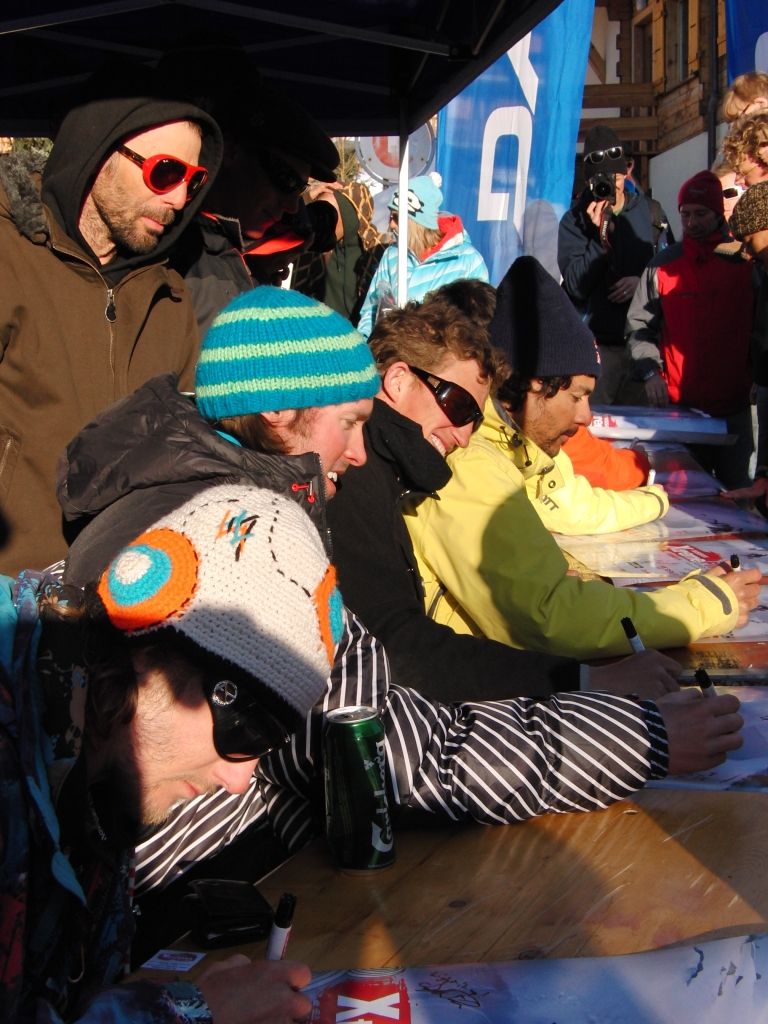 Am Nachmittag sind Hansi und ich dann noch in die Stadt gegangen, da dort ab heute der so genannte Street Fair anlässlich des diesjährigen Verbier Xtreme ist. Dort kann man unterschiedliche Merchendise Artikel zu diesem Event kaufen, es ist Musik geboten, ein paar Sponsoren stellen Ihre Produkte vor (Nissan, Scott, etc.) und dann kann man noch, was ich persönlich echt immer super finde, die ganzen Freestyle Profis, die an dem Event mitmachen direkt und hautnah sehen, kennenlernen und auf dem aktuellen Verbier Xtreme Poster Autogramme mit persönlichen Widmungen von ihnen bekommen. Das ist echt supi. Ich hab mir natürlich gleich ein Poster geschnappt und dieses von den Jungs und den Mädels (wobei es nicht wirklich viel Mädels sind) vollschreiben lassen. Das ist jetzt dann schon das dritte Poster in Folge, welches ich vollkritzeln lassen konnte. Das wird, wie die anderen die Jahre davor, auch einen Ehrenplatz in unserer Verbier Xtreme Ecke im Treppenflur bekommen.