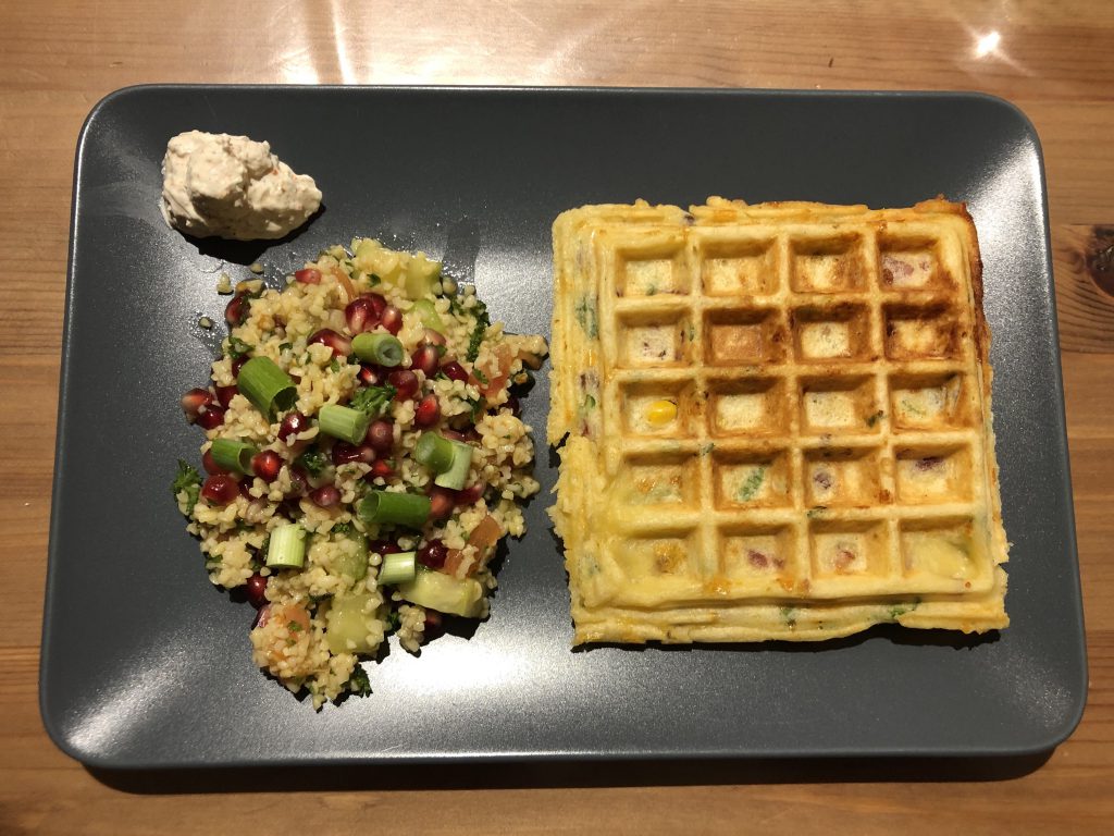 Auch in diesem Jahr gibt es wieder die regelmäßigen Waffelmontag. Das hat sich die letzten Jahre über so dermaßen eingebürgert mit immer wieder teils wechselnden netten Leuten an meinem Tisch, dass eigentlich seltenst ein Montag vergangen ist, an dem nicht gesamt acht Leute an meinem Tisch saßen. Ich mag so was herrlich unkompliziertes ja wirklich gerne leiden. Letzten Montag zum Beispiel gab es folgende Waffeln: Bacon/Cheddar Cheese Waffeln mit Frühlingszwiebeln und Mais, dazu Granatapfel Taboulé und Kräuter Schmand Creme