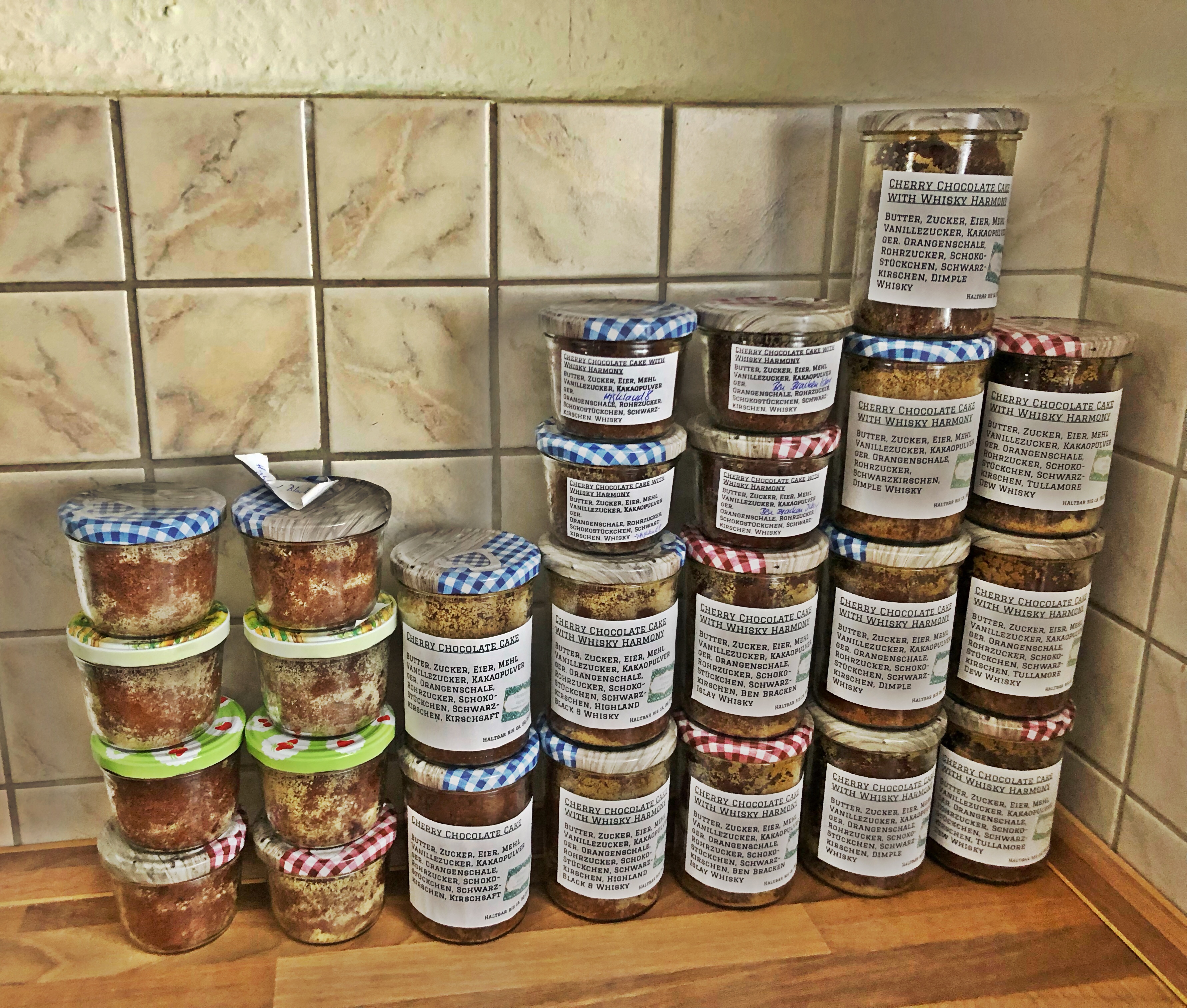 Eine Kirsch Schokoladen Kuchen Variante im Glas mit diversen Aromen. Ich habe das Ganze „Cherry Chocolate Cake with Whisky Harmony“ getauft. Vier verschiedene Whiskys wurden in derselben Teigbasis verbacken und werden jetzt dann kommende Woche mal verkostet von Whiskykennern. Mal schauen welche der vier Varianten sie bei der Blindverkostung bevorzugen werden. Ich bin sehr gespannt. Aktuell stapeln sich die Gläser der ersten Versuchsreihe in meiner Küche.