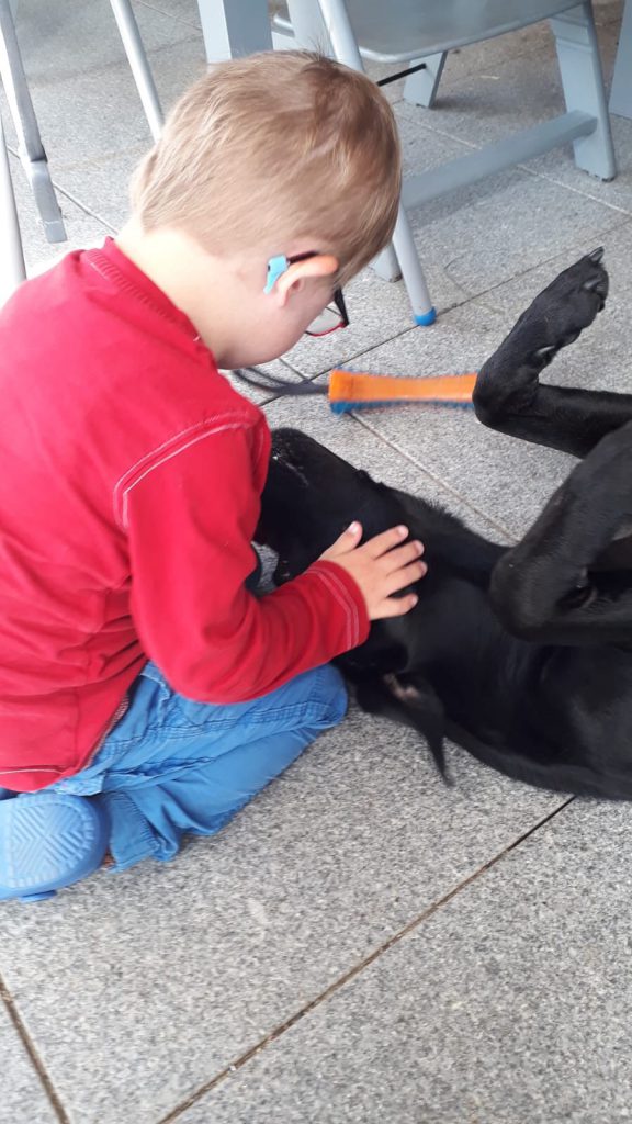 Mein zweites Patenkind, Luis, war natürlich voller Freude „seine“ Hunde um sich zu haben. Ich könnte stundenlang zusehen wie er mit den Hunden umgeht, kommuniziert und somit auch seine Entwicklung gut gefördert wird. Für mich oder die anderen Außenstehenden ist die Art der Kommunikation zwischen Beau, Elvis und Luis nicht „durchschaubar“ aber das ist auch gut so. Die drei sind eine eingeschworene Bande und die Hunde haben von Anfang an verstanden, dass Luis etwas ganz besonderes ist. So behutsam wie die drei miteinander umgehen, zusammen Spaß haben und die Zeit jedes Mal genießen sieht man wirklich sonst nur selten. Und es ist wirklich schön, dass es so harmonisch ist. Mir geht das jedes Mal wirklich das Herz auf. Und ich bin auch sehr sehr stolz auf meine beiden schwarzen Jungs, dass sie von Anfang an so unkompliziert, zuverlässig und toll mit allen meinen Patenkindern umgegangen sind.