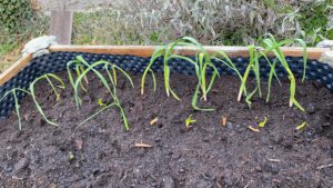 und außerdem habe ich dann noch rote Zwiebeln in das Beet gepflanzt. Die hatte ich letztes Jahr schon „Roter Baron“ nennt sich diese Zwiebel Sorte und letztes Jahr sind da echt leckere Zwiebeln raus gewachsen. Ich habe dann auch in mein drittes Hochbeet die ersten Sachen eingesetzt. Die langen Setzlings“stängel“ gehören zum von mir selbst gezogenen Knoblauch