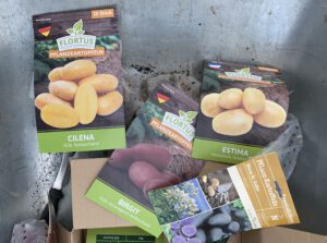 seht nichts 😉 Es ist alles mehr oder minder unterirdisch in dem Hochbeet gepflanzt. Vier unterschiedliche Sorten Kartoffeln habe ich gepflanzt. Auf dem Foto könnt ihr sehen was für Sorten.