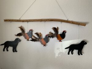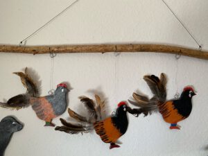 Eine Anfertigung meiner Mitbewohner. Alle drei Hennen, original getreu sogar mit den original Ringfarben an den Beinen und originalen Federn von ihnen (aus der Mauser hatte ich die aufgehoben und sie ihnen mal zum Traumfänger Basteln gegeben) und natürlich Beau und Elvis auch noch dabei