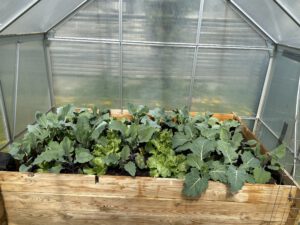 Natürlich darf auch ein obligatorische Gewächshausbild von den dort schon gesetzten Salaten und Kohlrabi fehlen. Es hat sich schon einiges an Wachstum dort getan 😉