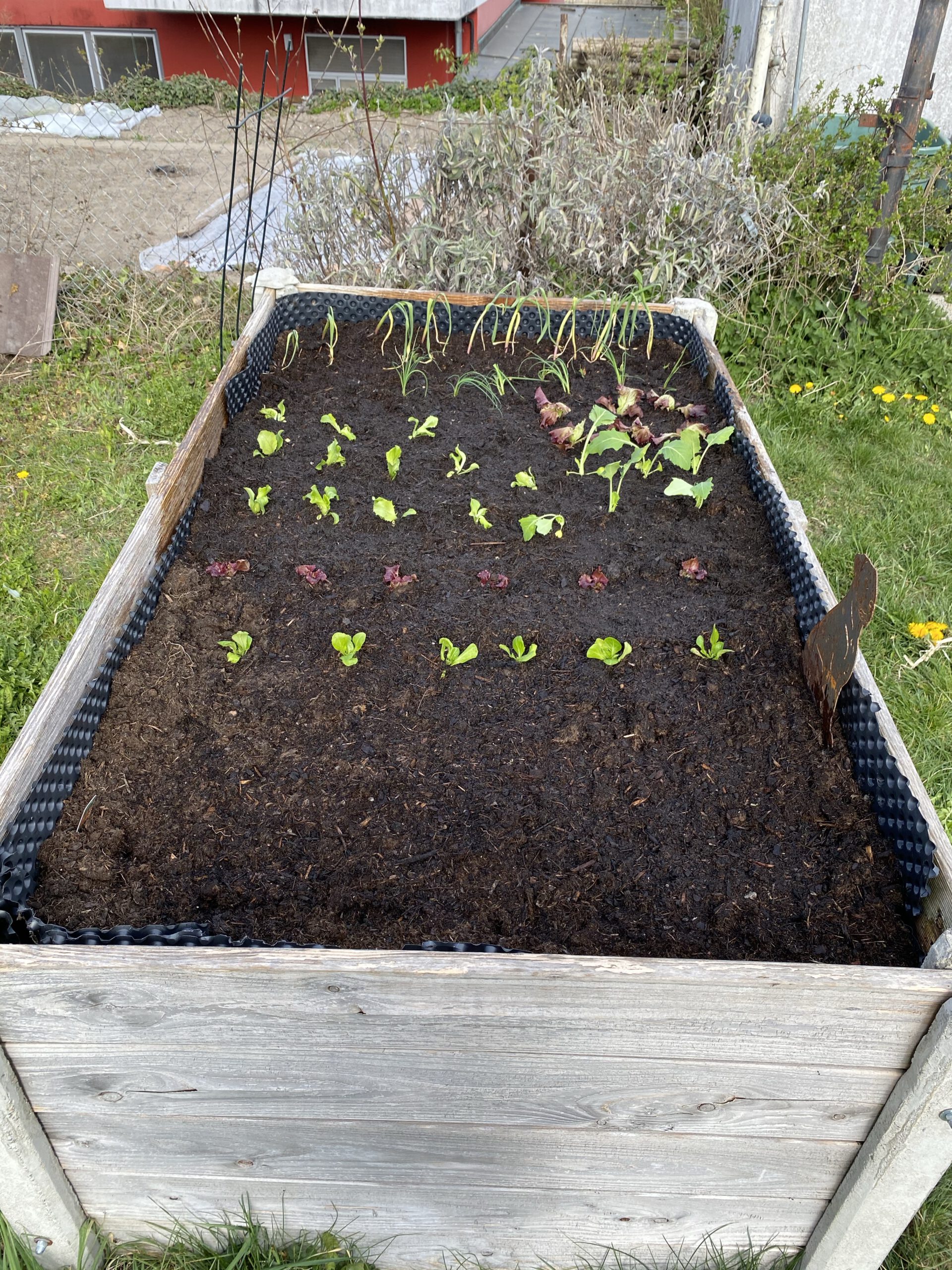 Zu dem schon gepflanzten Knoblauch und Schalotten, sind heute noch unterschiedliche Salatsorten dazu gekommen (Eisberg Salat, Lollo Rosso, Kopfsalat und Eichblattsalat) außerdem noch ein paar Kohlrabi, Porree, dann noch Rote Beete, Möhren und Radieschen (die letzten drei sieht man halt noch nicht, ist im vorderen Bereich und erst mal nur „unterirdisch“ 😉