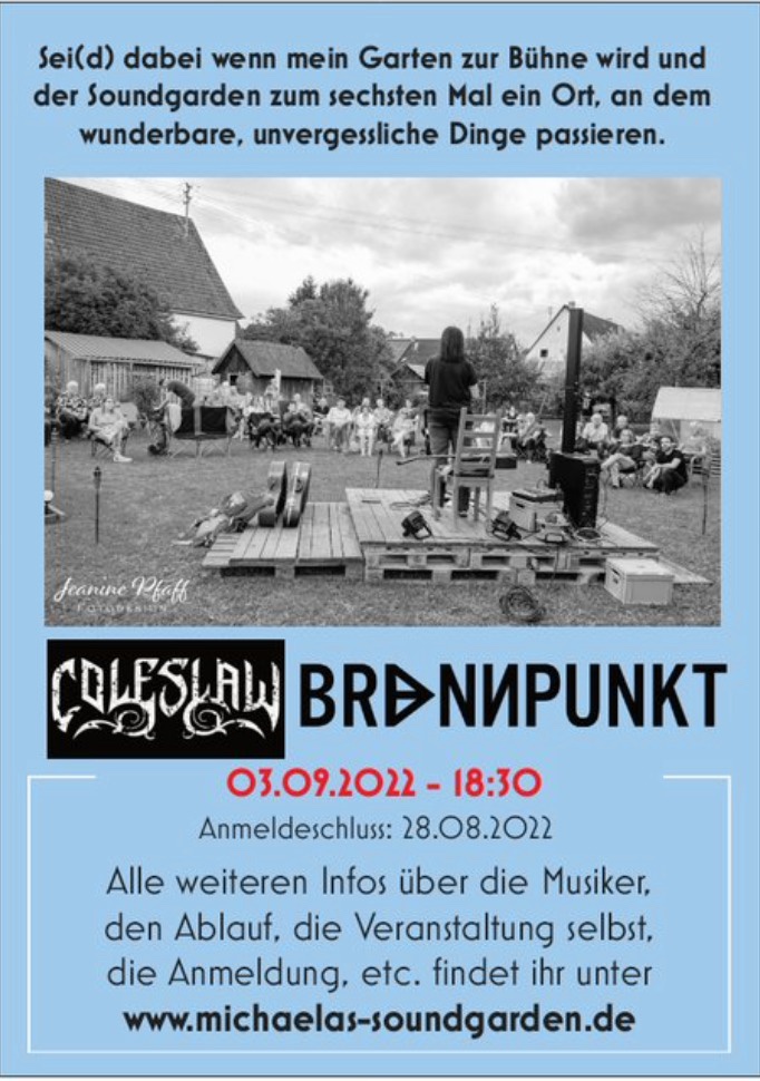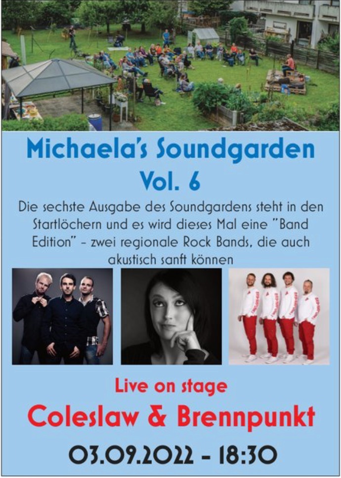 Die Planungen für den nächsten Soundgarden sind auch angelaufen und es ist mir eine Freude verkünden zu können, dass es dieses Jahr eine so genannte „Band Edition“ werden wird. Es spielen zwei unterschiedliche Bands an dem Abend. Die Flyer sind auch gedruckt (wer in Papierform einen möchte kann sich gerne einfach bei mir melden) und man kann sich auch schon direkt dafür anmelden bei mir. Alle Infos rund um den Soundgarden findet ihr, wie letztes Jahr auch schon auf der Soundgarden Webseite unter www.michaelas-soundgarden.de