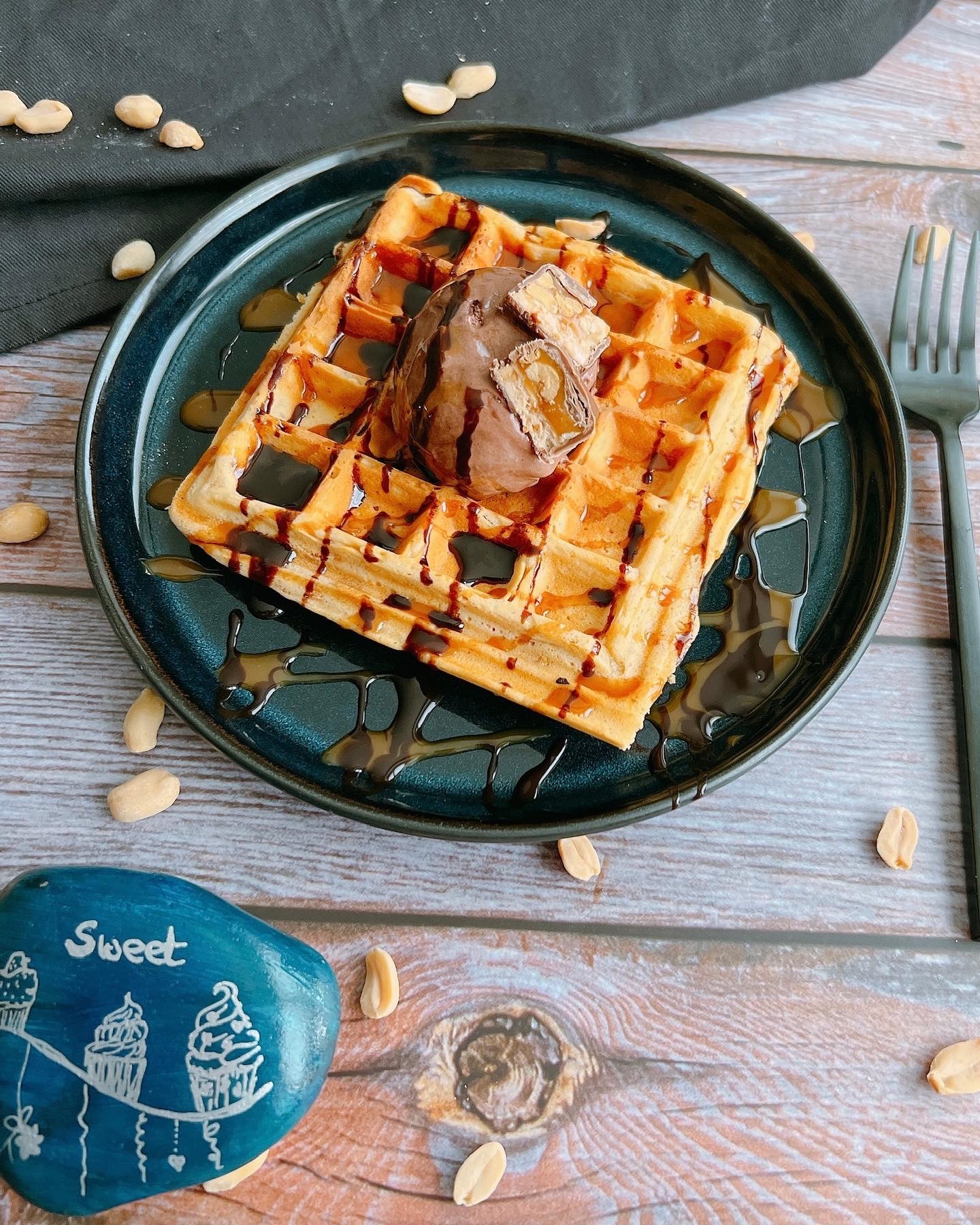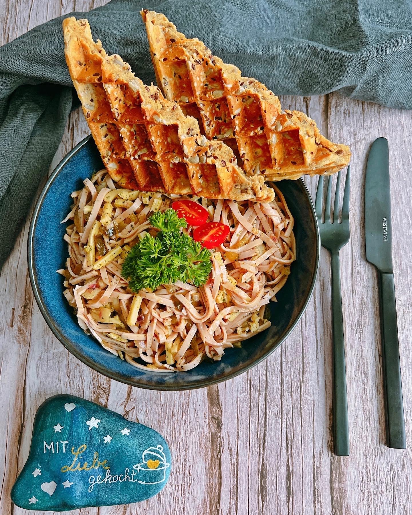 Letzte Woche waren mal wieder zwei Waffelrezepte dran. Erdnusswaffeln „Snickers Art“ mit Schokoeis, Karamell- und Schokosoße und Schweizer Wurstsalat mit Mehrkorn Brot-Waffeln